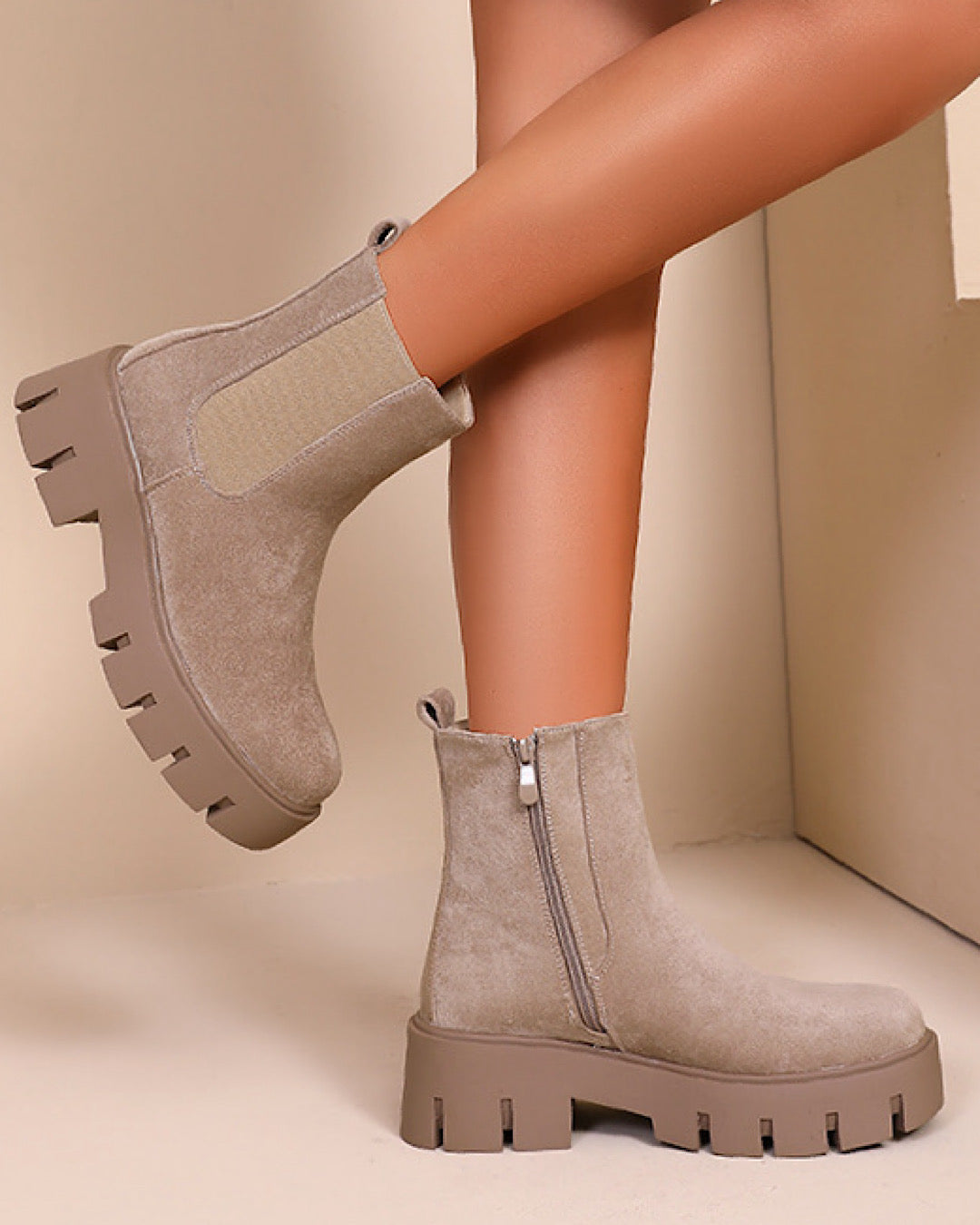 Expertly crafted with faux suede and a chunky sole, these Beige Chelsea Boots are both stylish and practical. The side zip allows for easy on and off, making them the perfect addition to any wardrobe. Elevate your outfit with the timeless and versatile look of these boots.