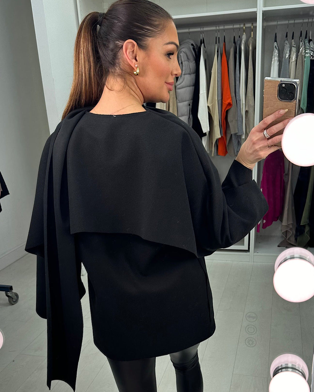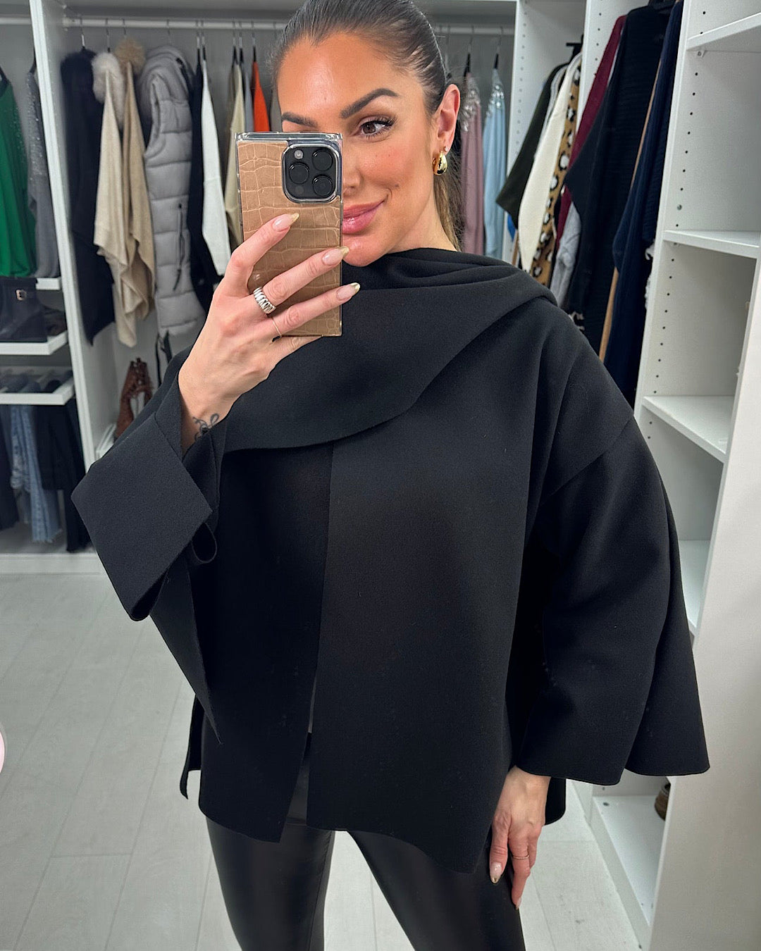 This Black Wrap Cape Jacket features a high neck and a wrap-over design with long sleeves, providing both style and warmth. The elegant silhouette adds a touch of sophistication to any outfit, making it a versatile addition to your wardrobe. Stay warm and chic with this must-have jacket.