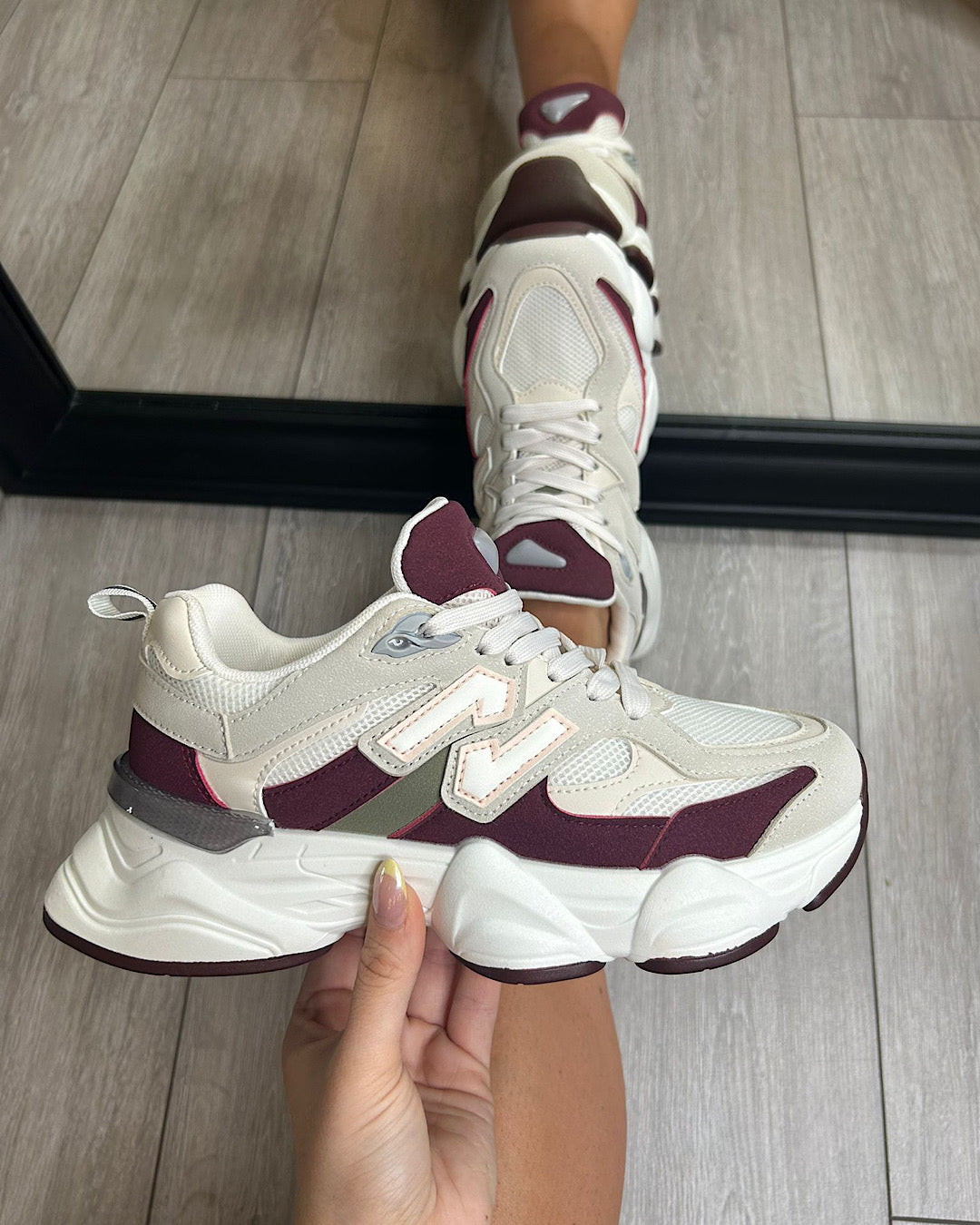 Introducing our Chunky Lace Up Trainers, designed with a thick sole for added support and a lace up fastening for a secure fit. The classic burgundy with beige accents makes these trainers versatile and stylish. Available in sizes 3-8. Elevate your footwear game with these trainers.