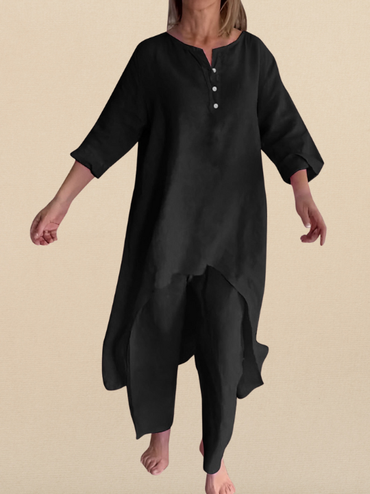 Ten dwuczęściowy komplet składa się z długiego topu i luźnych spodni z długim rękawem, idealnych na ciepłe dni. Z guzikiem na swetrze i lekkim, elastycznym T-shircie, to doskonały wybór na letnie, casualowe stylizacje.