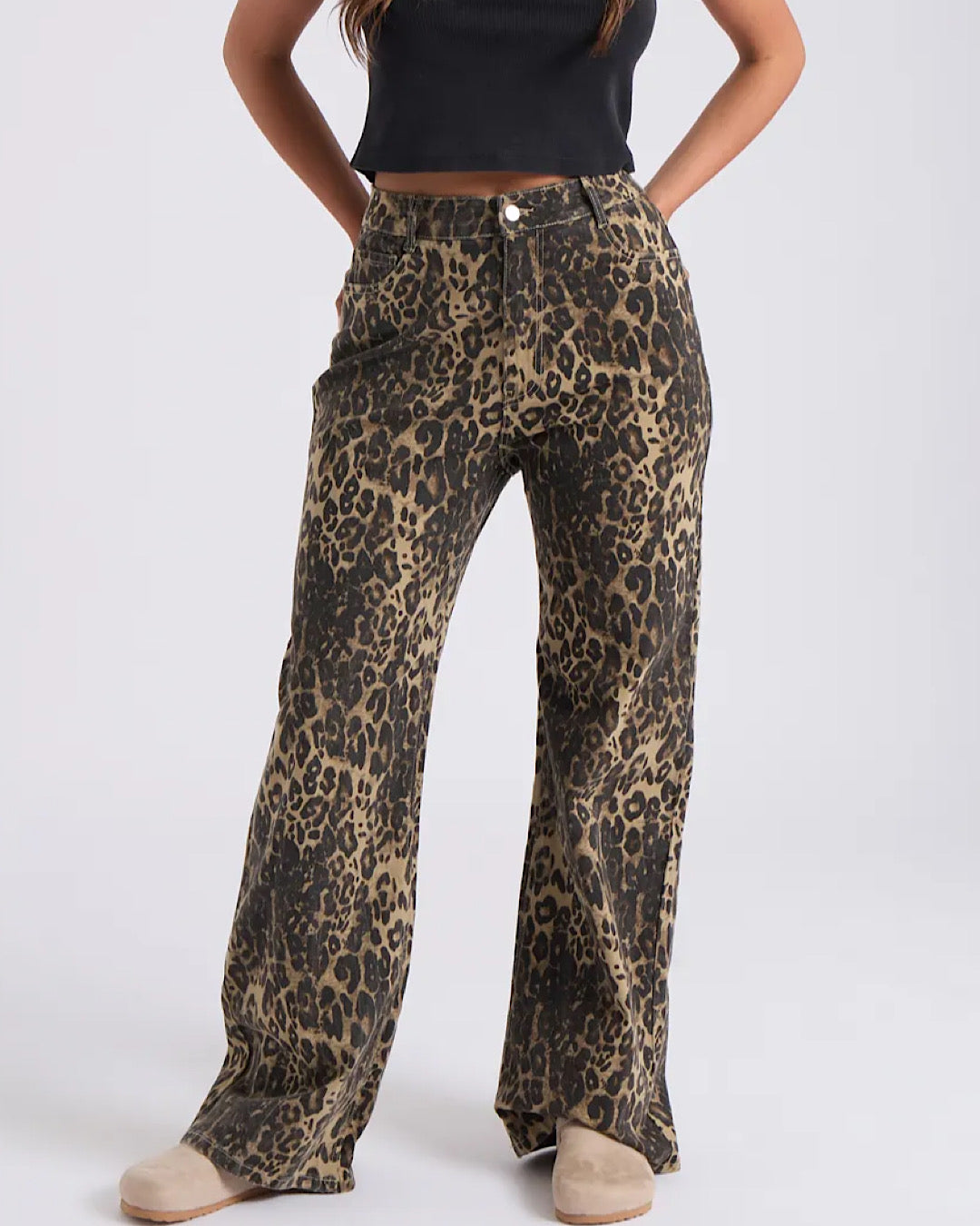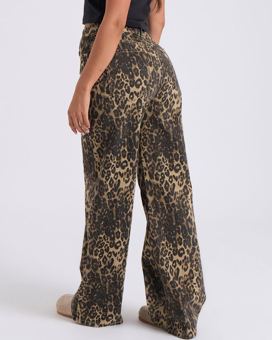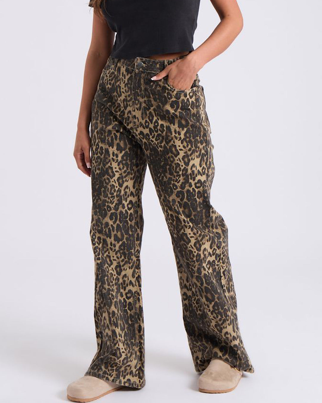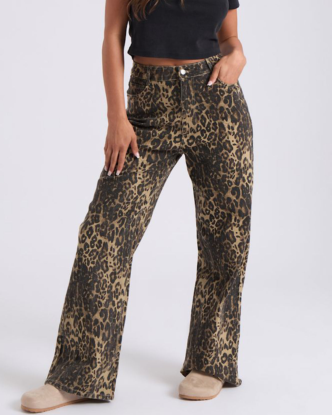 Unleash your wild side with these standout wide leg leopard print jeans. Sizes 8-14 available, perfect for adding a playful touch to your wardrobe. (Not for the faint of fashion - these jeans are for the fierce and fearless!)